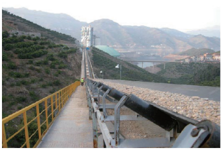 石灰石破碎機(jī)設(shè)在礦山平峒內(nèi),破碎后的石灰石通過一條下山長膠帶機(jī)輸送廠區(qū)石灰石均化庫。膠帶機(jī)主要參數(shù):帶寬1200mm、水平距離1.965km、皮帶頭尾高差302m、大傾角—10.7°、大輸送量1400t/h、大帶速2.5m/s、大運(yùn)行功率-800kW。因物料輸送落差太大,其平穩(wěn)啟停、制動(dòng)及電機(jī)同步、功率平衡成了控制的關(guān)鍵。