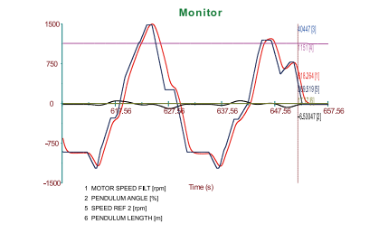 此方案采用提升軟件和防搖軟件配合使用,通過初始位置測定吊臂的擺長,通過提升機構(gòu)的編碼器計算實際高度的吊臂長度,來補償實際位置高度的擺長,這樣來計算實際的擺角,通過控制大、小車在啟動和停止時的加速度,來控制實際的擺角,減小擺動幅 度。見下圖實際波形: