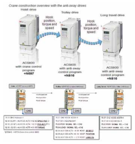 此垃圾吊分為三個機構(gòu):提升,大車,小車。分別采用ABB的ACS800變頻器。具體如下: