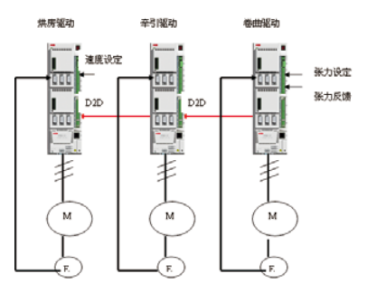 主速度給定由上位機(jī)發(fā)送給烘房驅(qū)動(dòng),烘房驅(qū)動(dòng)再把實(shí)際速度通過D2D通訊(ACSM1驅(qū)動(dòng)器之間交換數(shù)據(jù)的通訊方式)發(fā)送給牽引驅(qū)動(dòng)器和卷曲驅(qū)動(dòng)器。通過參數(shù)可以設(shè)定各個(gè)驅(qū)動(dòng)器之間的傳動(dòng)比例。每臺(tái)驅(qū)動(dòng)器都配備編碼器,用來提高速度控制精度。