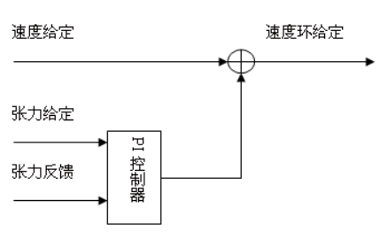 本次應(yīng)用中的卷曲驅(qū)動(dòng)器采用了張力速度修正控制方式,卷曲驅(qū)動(dòng)器接收張力設(shè)定以及張力反饋信號(hào),內(nèi)部進(jìn)行PI運(yùn)算處理,把生成的調(diào)節(jié)值加到速度環(huán)設(shè)定值上作為實(shí)際速度給定,如下圖: